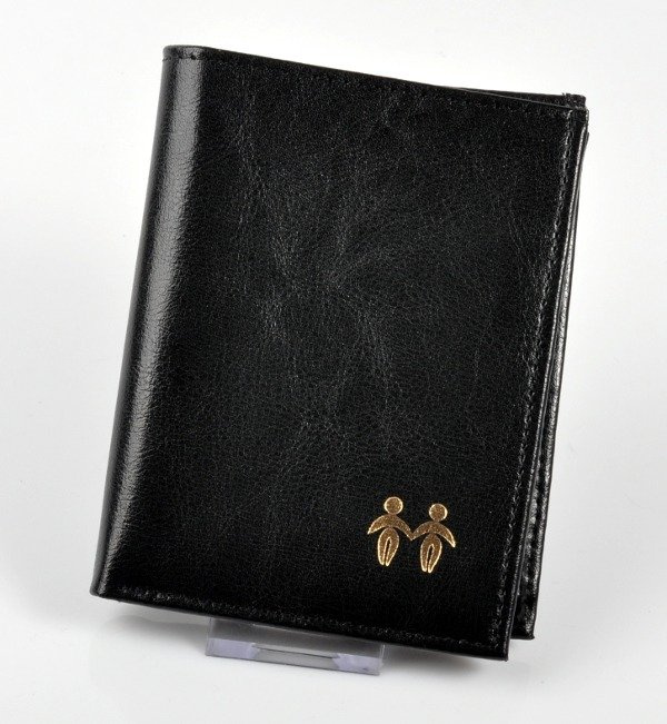 Z przodu portfela wykonany jest znak zodiaku bliźnięta ( taki jak na zdjęciu) metodą tłoczenia na gorąco.