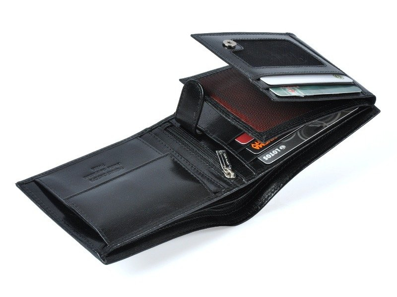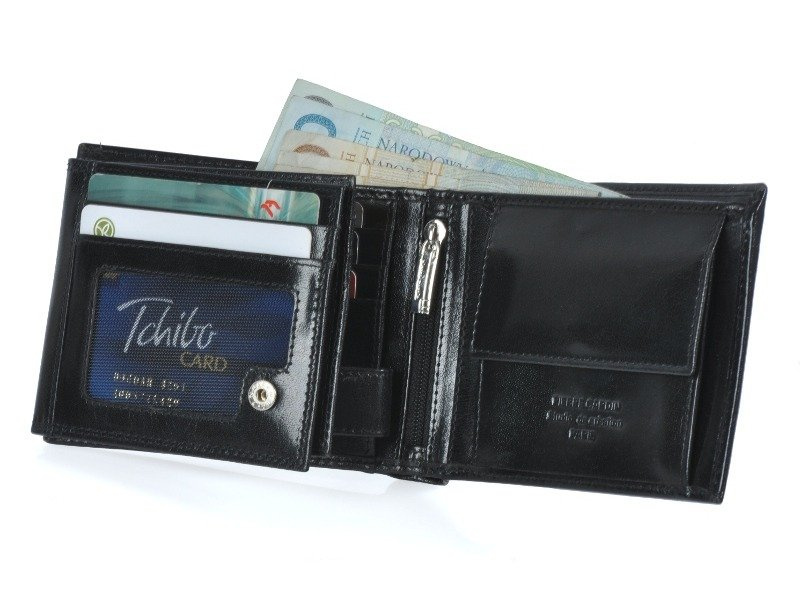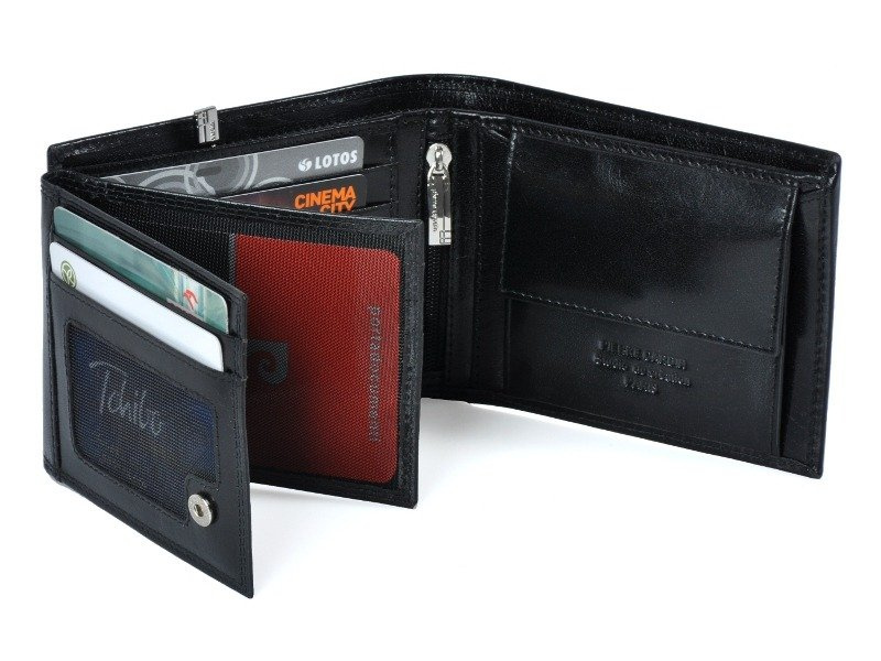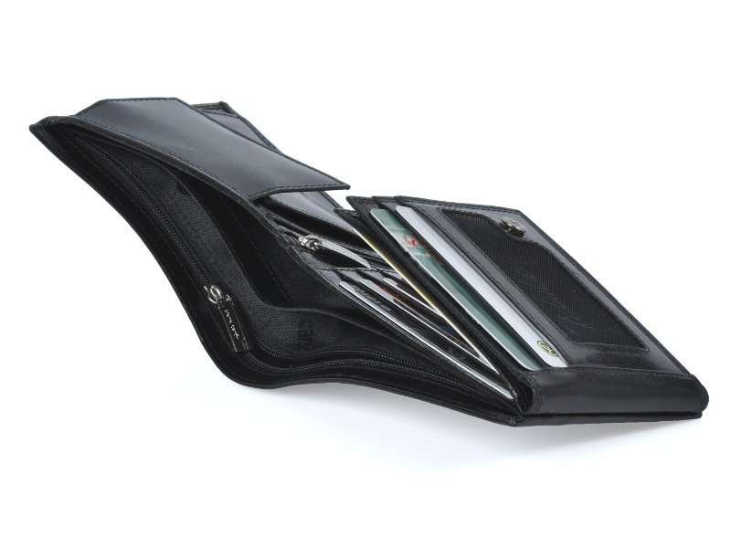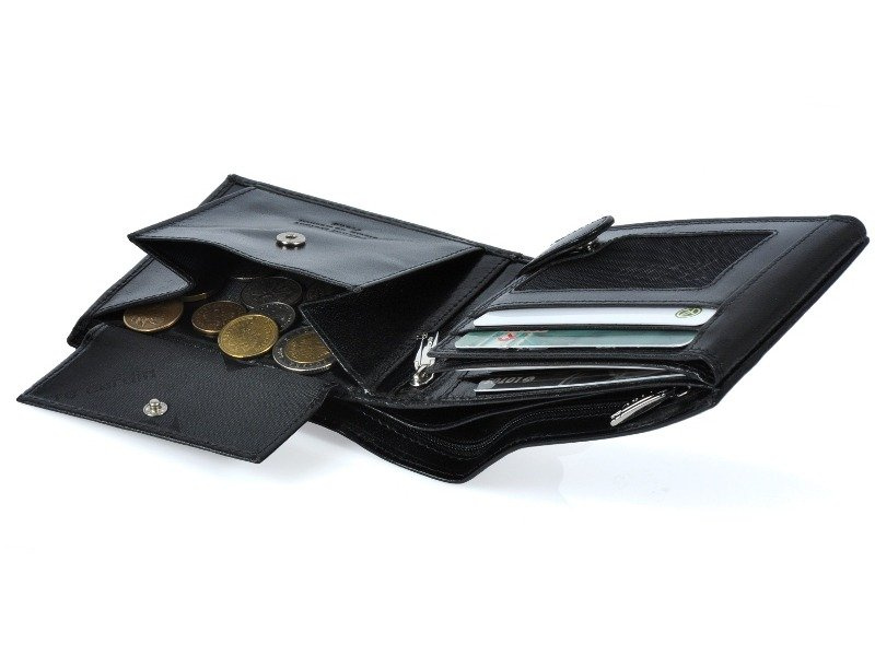 oferuje wiele przegródek – 11 miejsc na karty i wizytówki, 3 kieszonki siateczkowe, kieszeń na zamek oraz dwie kieszenie na banknoty (jedna na suwak),
