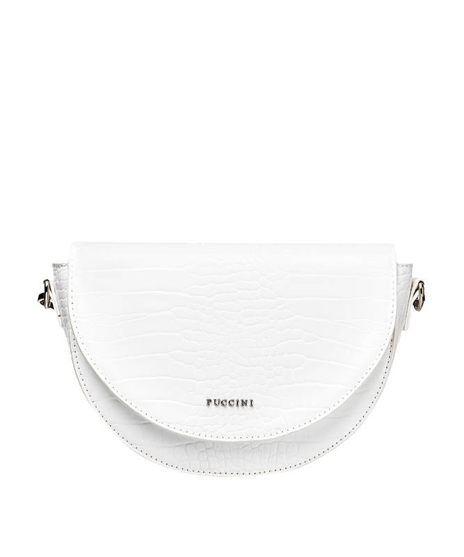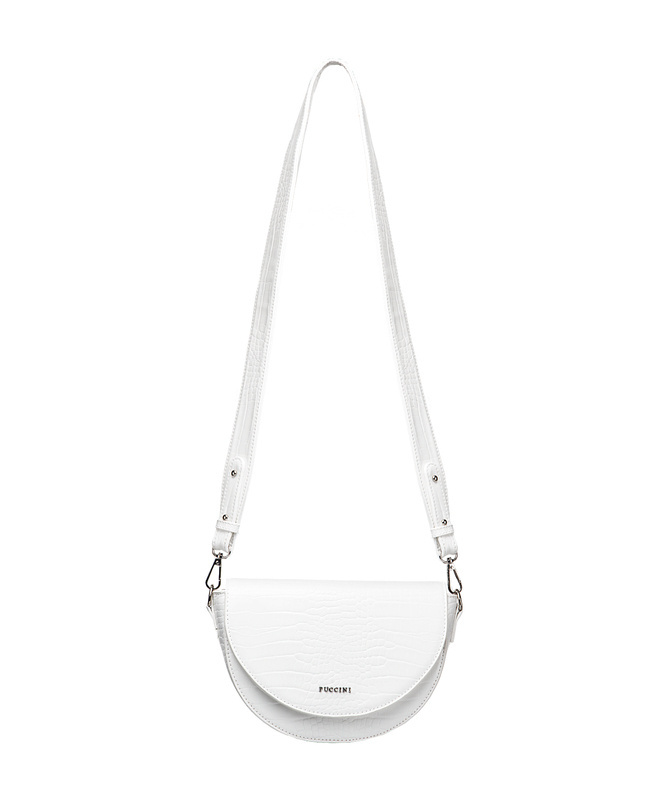 Torebka jest niewielkich rozmiarów, ale dzięki zastosowaniu dodatkowych kieszonek pomieści wszystko czego potrzebujesz na wyjście. Wewnątrz komory głównej znajdują się dwie kieszonki: jedna otwarta, druga zapinana na zamek. Na froncie listonoszka posiada półokrągłą klapę zamykaną na magnes z subtelnym logo Puccini w kolorze srebra. Torebkę można nosić na ramieniu lub poprzek ciała.