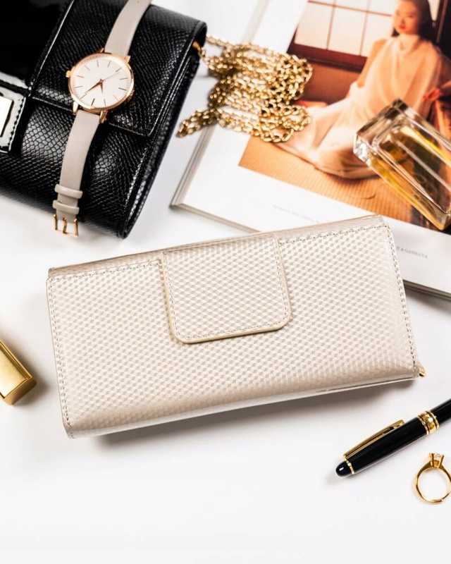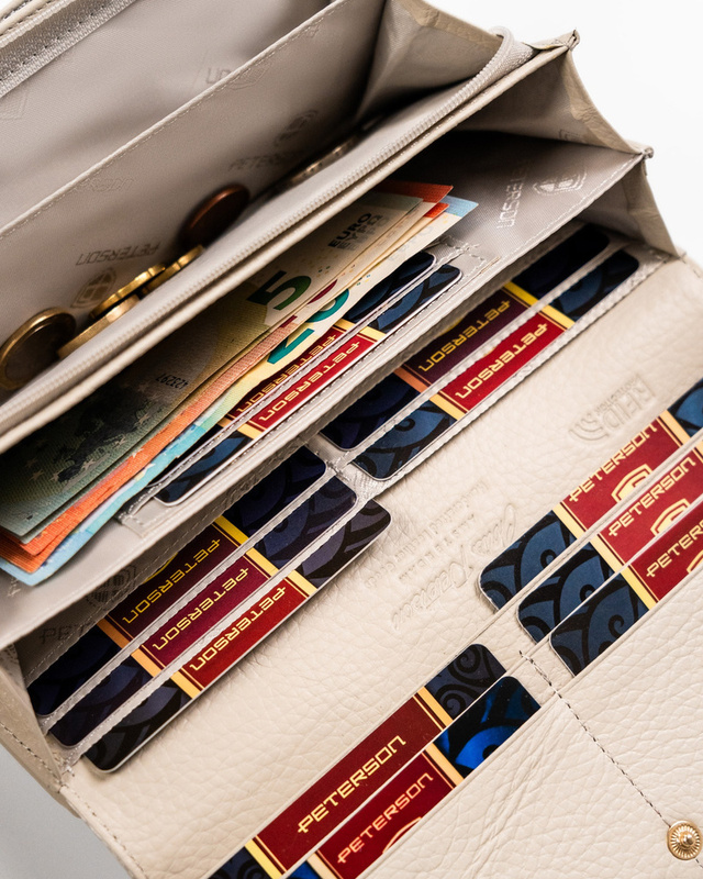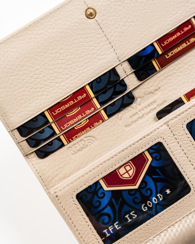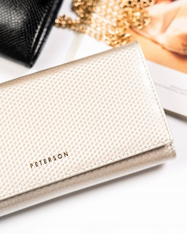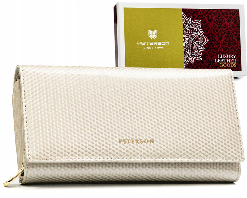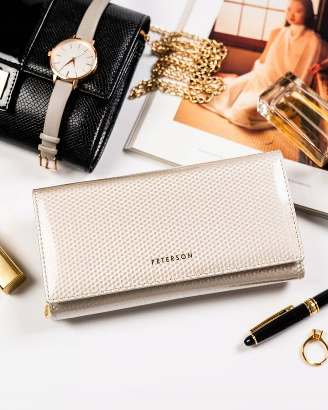 Portfel damski polskiej marki PETERSON w jasnym kolorze, wykonany jest z naturalnej lakierowanej skóry. To zdecydowanie duża portmonetka, bo o wymiarach 19,5 x 10,5 cm.