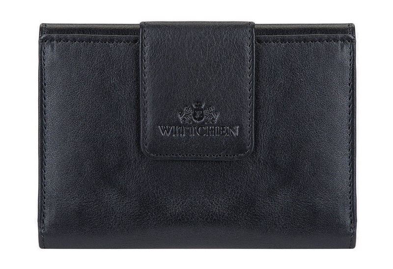 Portfel damski, który oferujemy, posiada kieszeń na bilon na zewnątrz, zamykaną na zatrzask. Z drugiej strony po otwarciu portfela, od góry podwójna kieszeń na banknoty, natomiast po bokach i na środku kieszenie na karty lub wizytówki oraz większe kieszenie dodatkowe na dokumenty, w tym trzy z siateczką. Jest bardzo wygodny w użytkowaniu, ponieważ posiada małe wymiary, 10 cm x 14,5 cm, dzięki czemu idealnie zmieści się do torebki. Główna część portfela zapinana jest na napę z zatrzaskiem. Posiada wytłoczone logo firmy Wittchen, zyskując tym na oryginalności i wyjątkowości.