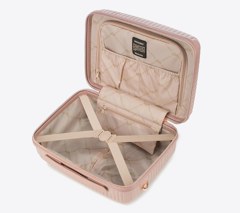 - Pasek z tyłu umożliwiający mocowanie kosmetyczki na rączce od walizki.