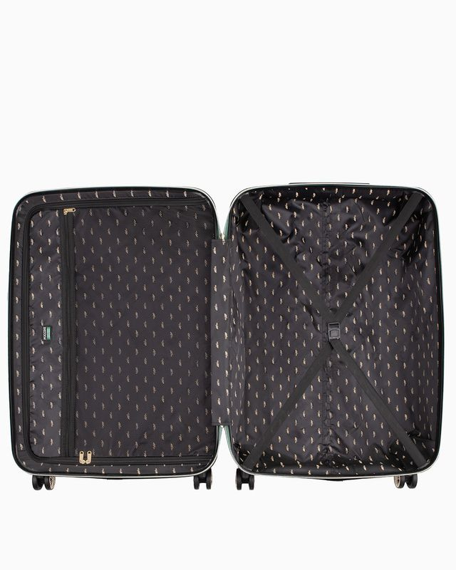 W środku znajdują się 2 komory (1 zamykana kieszonką, druga wyposażona w pasy), w których zmieści się duża ilość ubrań (pojemność produktu to 87 l.). Walizka wyposażona jest w pasy zapobiegające przemieszczaniu się rzeczy oraz w małą kieszonkę zapinaną na suwak.