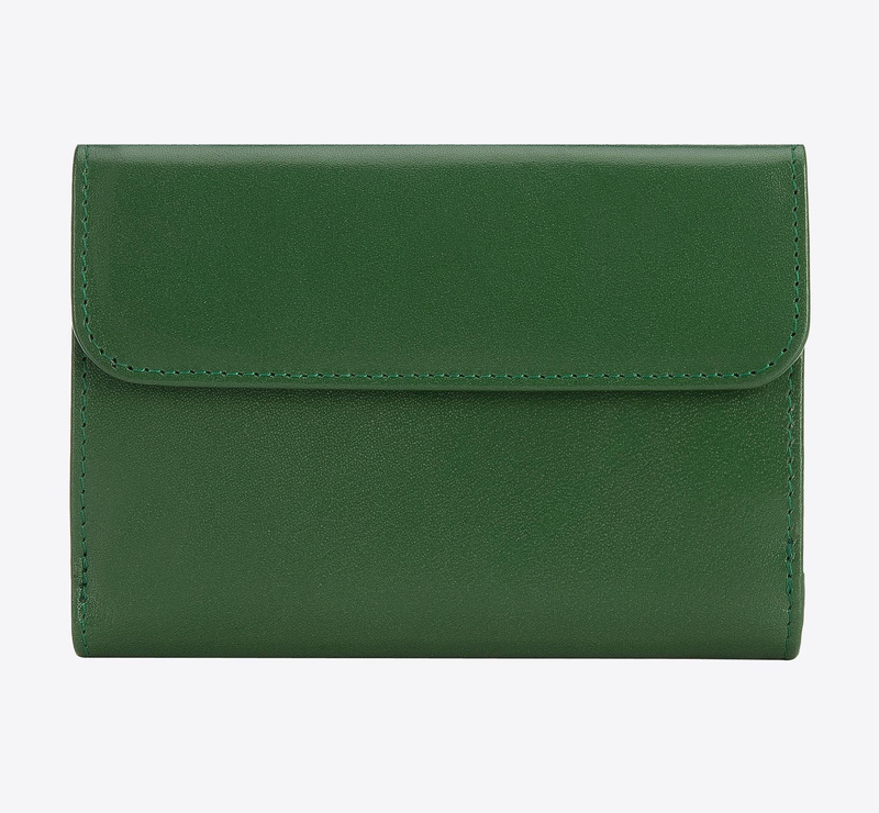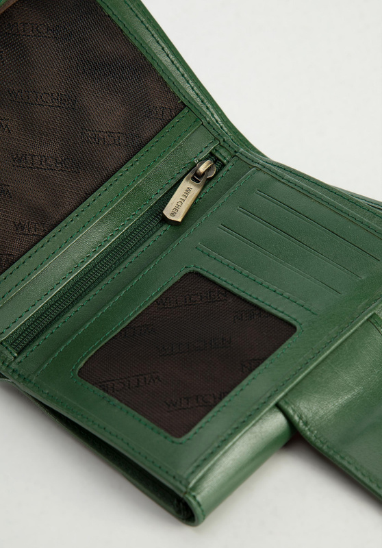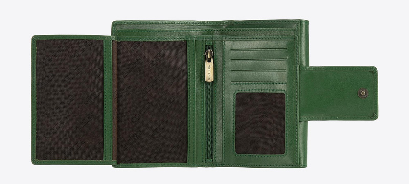 - trzykomorowa kieszeń na bilon, całość zapinana na zatrzask (dwie komory otwarte jedna na suwak),
