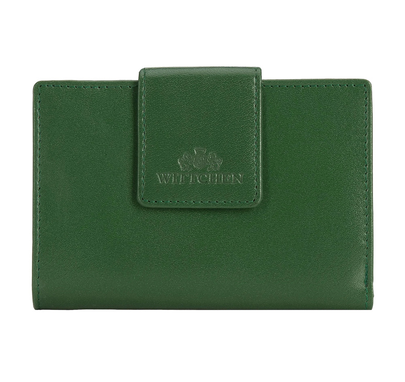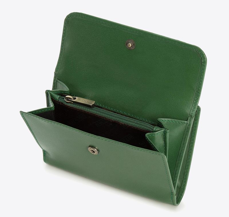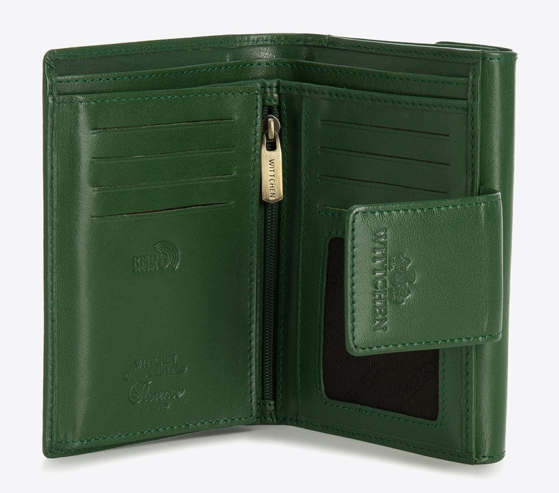 Portfel damski, który oferujemy, posiada kieszeń na bilon na zewnątrz, zamykaną na zatrzask. Z drugiej strony po otwarciu portfela, od góry podwójna kieszeń na banknoty, natomiast po bokach i na środku kieszenie na karty lub wizytówki oraz większe kieszenie dodatkowe na dokumenty, w tym trzy z siateczką. Jest bardzo wygodny w użytkowaniu, ponieważ posiada małe wymiary, 10 cm x 14,5 cm, dzięki czemu idealnie zmieści się do torebki. Główna część portfela zapinana jest na napę z zatrzaskiem. Posiada wytłoczone logo firmy Wittchen, zyskując tym na oryginalności i wyjątkowości.