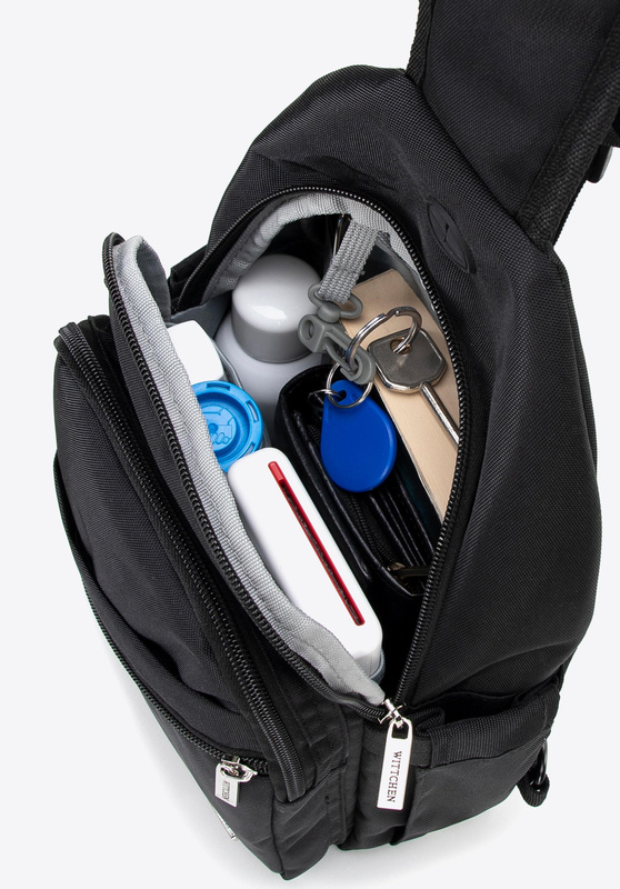 Trzy frontowe kieszenie na zamek – pozwalają łatwo uporządkować zawartość (portfel, słuchawki, telefon).