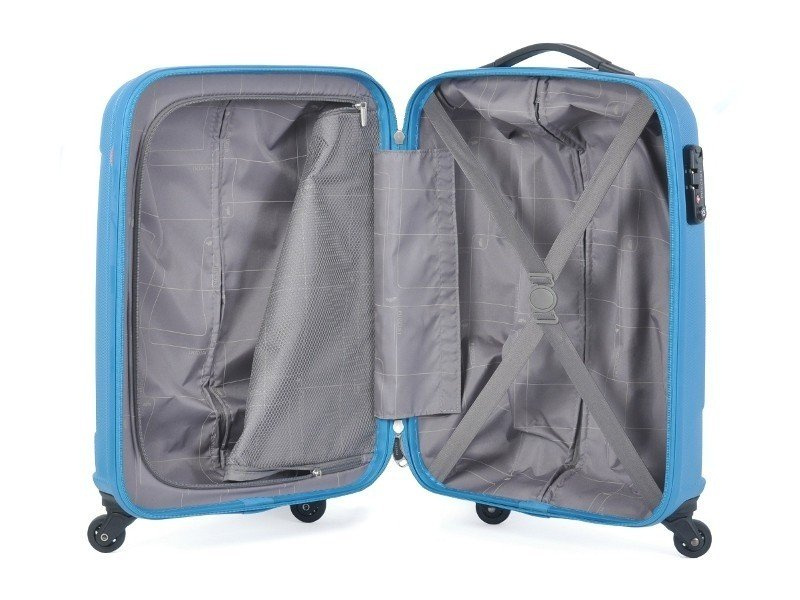 - klapa walizki zabezpieczona przegrodą zapinaną na zamek, a na niej obszerna kieszeń siatkowa,