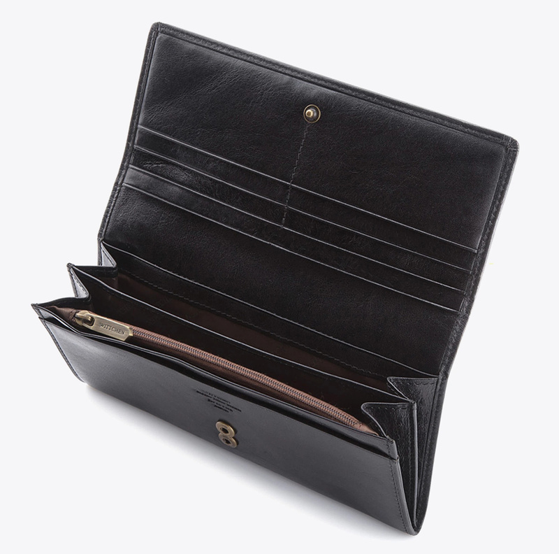 Przestronny i funkcjonalny – posiada dwa miejsca na banknoty, kieszeń na bilon zapinaną na suwak, 6 przegródek na karty oraz dodatkowe kieszenie na dokumenty.