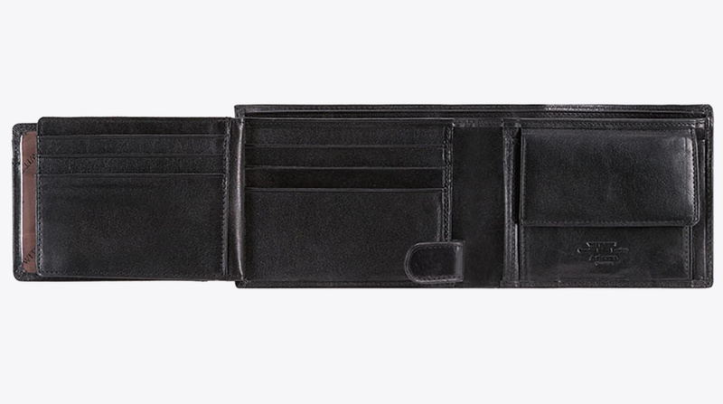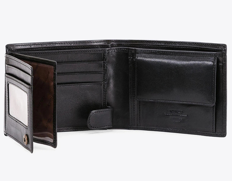 • Funkcjonalne wnętrze – 2 kieszenie na banknoty, kieszeń na bilon, 8 miejsc na karty i 4 dodatkowe kieszenie.
