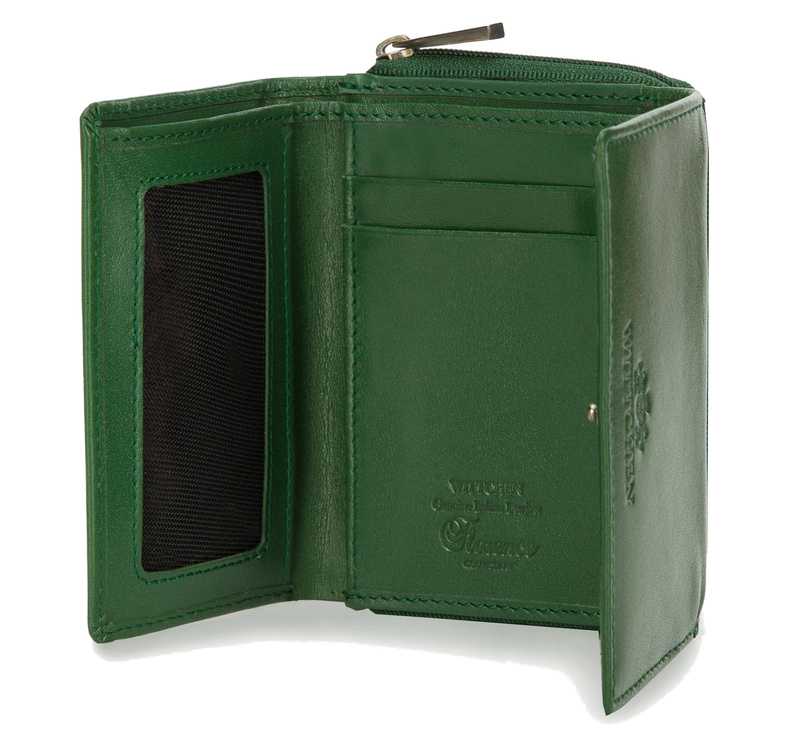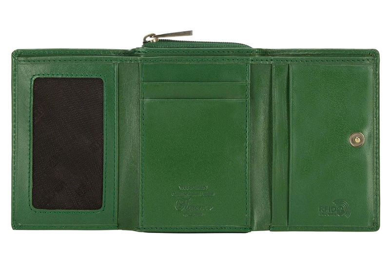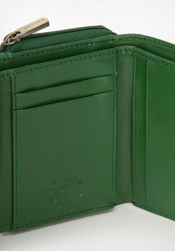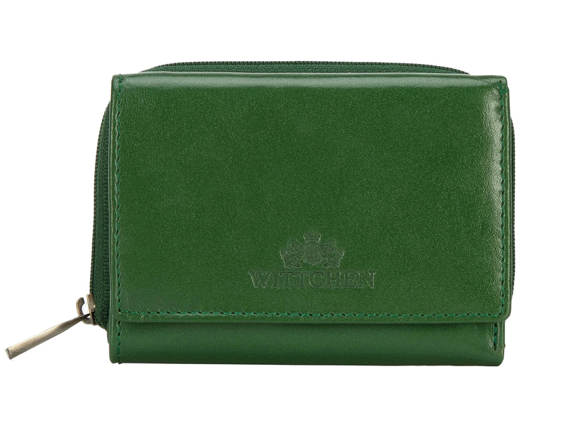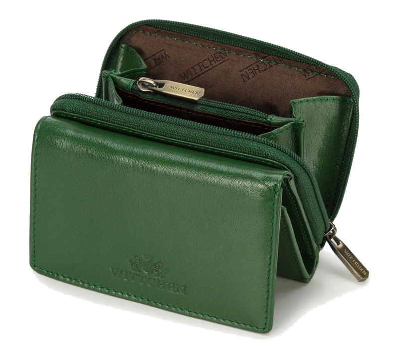 Portfel damski, który oferujemy, posiada kieszeń na bilon na zewnątrz, zamykaną na zamek. Z drugiej strony po otwarciu portfela, od góry kieszeń na banknoty, natomiast po bokach i na środku kieszenie na karty lub wizytówki oraz większe kieszenie dodatkowe na dokumenty, w tym jedna z siateczką. Jest bardzo wygodny w użytkowaniu, ponieważ posiada małe wymiary, 8 cm x 11 cm, dzięki czemu idealnie zmieści się do małej torebki lub można nosić go w kieszeni spodni. Główna część portfela zapinana jest na zatrzask. Posiada wytłoczone logo firmy Wittchen, zyskując tym na oryginalności i wyjątkowości.