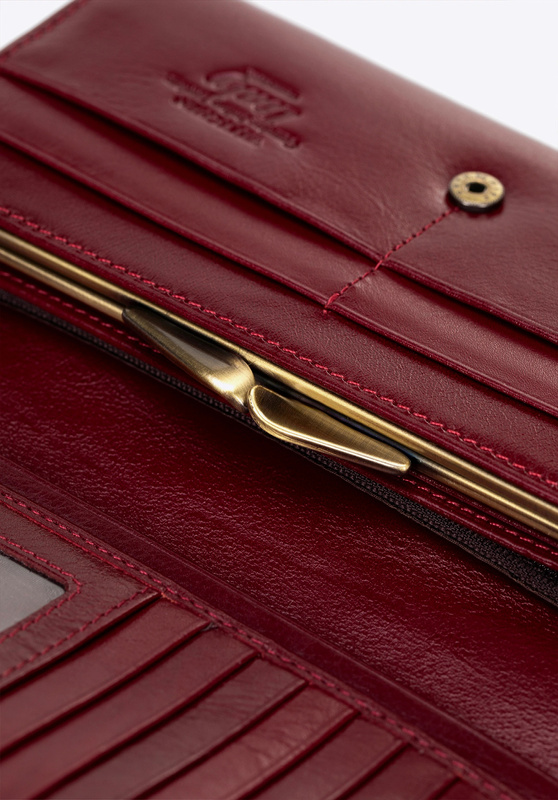 Kieszonka na bilon zamykana na bigiel jest schowana dzięki czemu sprawia, że portfel na zewnątrz jest subtelny i gustowny. Dzięki możliwości szerokiego otwarcia bigla jest niezwykle wygodna w użyciu. Mnogość i różnorodność kieszeni i przegród będzie doceniona przez Panie potrzebujące dużo miejsca na przechowywanie niezbędnych dodatków. Dla aktywnych kobiet zaś atutem jest fakt, iż portfel mieści dowód rejestracyjny pojazdu, nie tylko w przegrodach, ale również w ukrytej kieszeni pod kartami. Wszystkie przedstawione cechy sprawiają, że portfel świetnie sprawdzi się zarówno w codziennym użytkowaniu jak i podczas wieczornych wyjść, przyjęć.