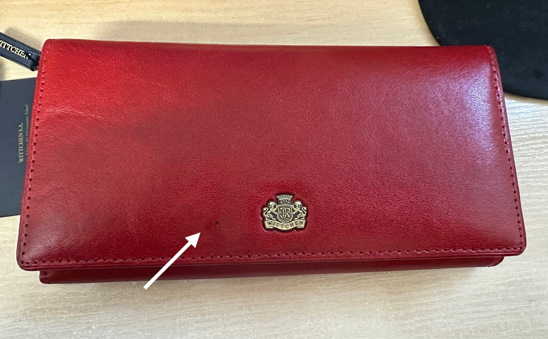 Produkt jest outletem ze względu na małą plamkę przy logo, na przodzie portfela.
