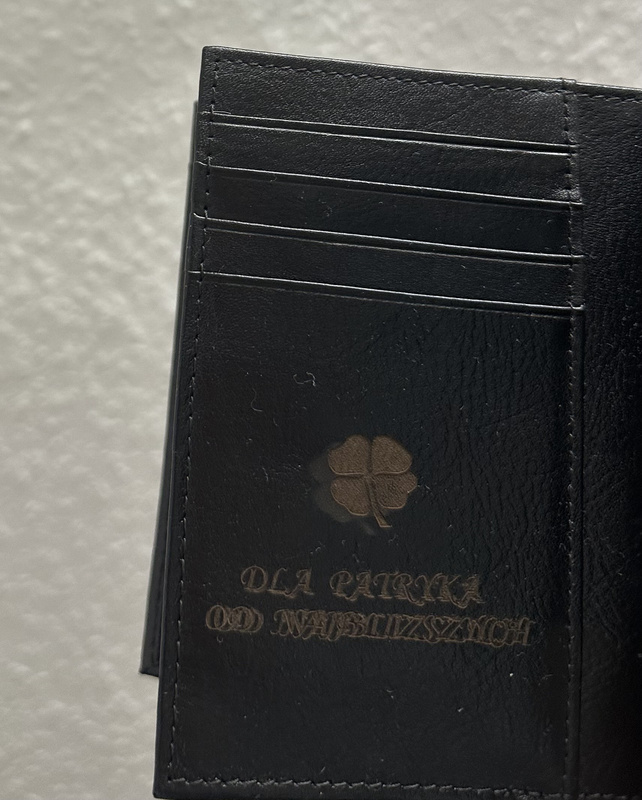 Produkt jest outletem ze względu na wykonany grawer na miejscu na karty, w środku portfela. Posiada on także rysę na skórze na przodzie, która widoczna jest na ostatnim zdjęciu.