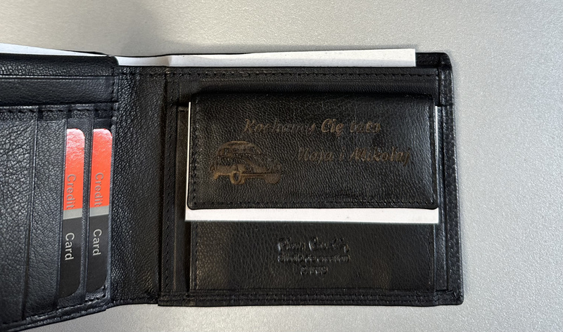 Produkt jest outletem ze względu na grawer ("Kochamy Cię tato. Maja i Mikołaj"), który widoczny jest na ostatnim zdjęciu. Grawer umiejscowiony jest w środku portfela, na miejscu na kieszonce na bilon.