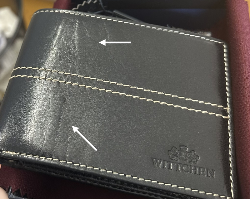 Produkt jest outletem ze względu na nierówności na skórze z przodu portfela.