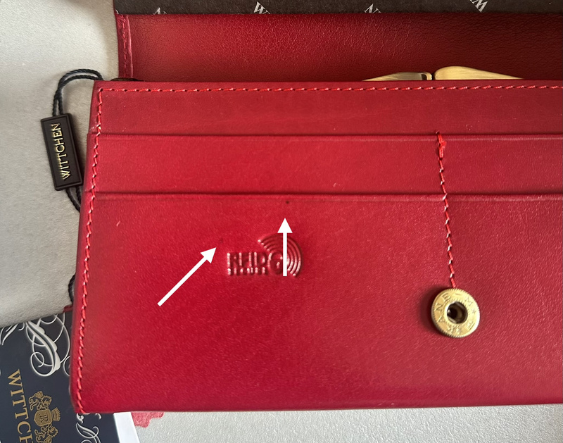Produkt jest outletem ze względu na dwie malutkie plamki w środku portfela, przy znaku RFID (na ostatnim zdjęciu zaznaczone strzałkami).